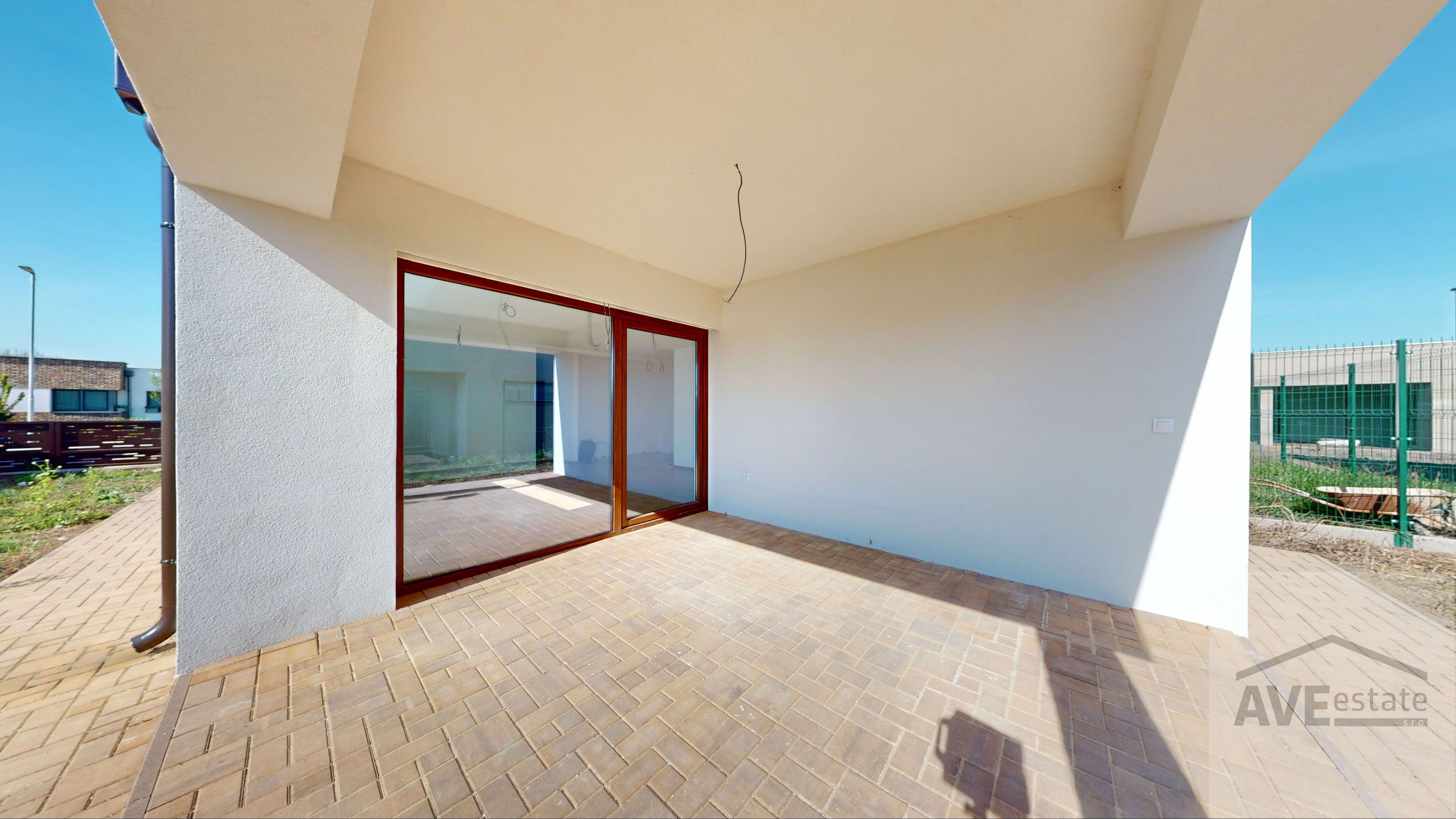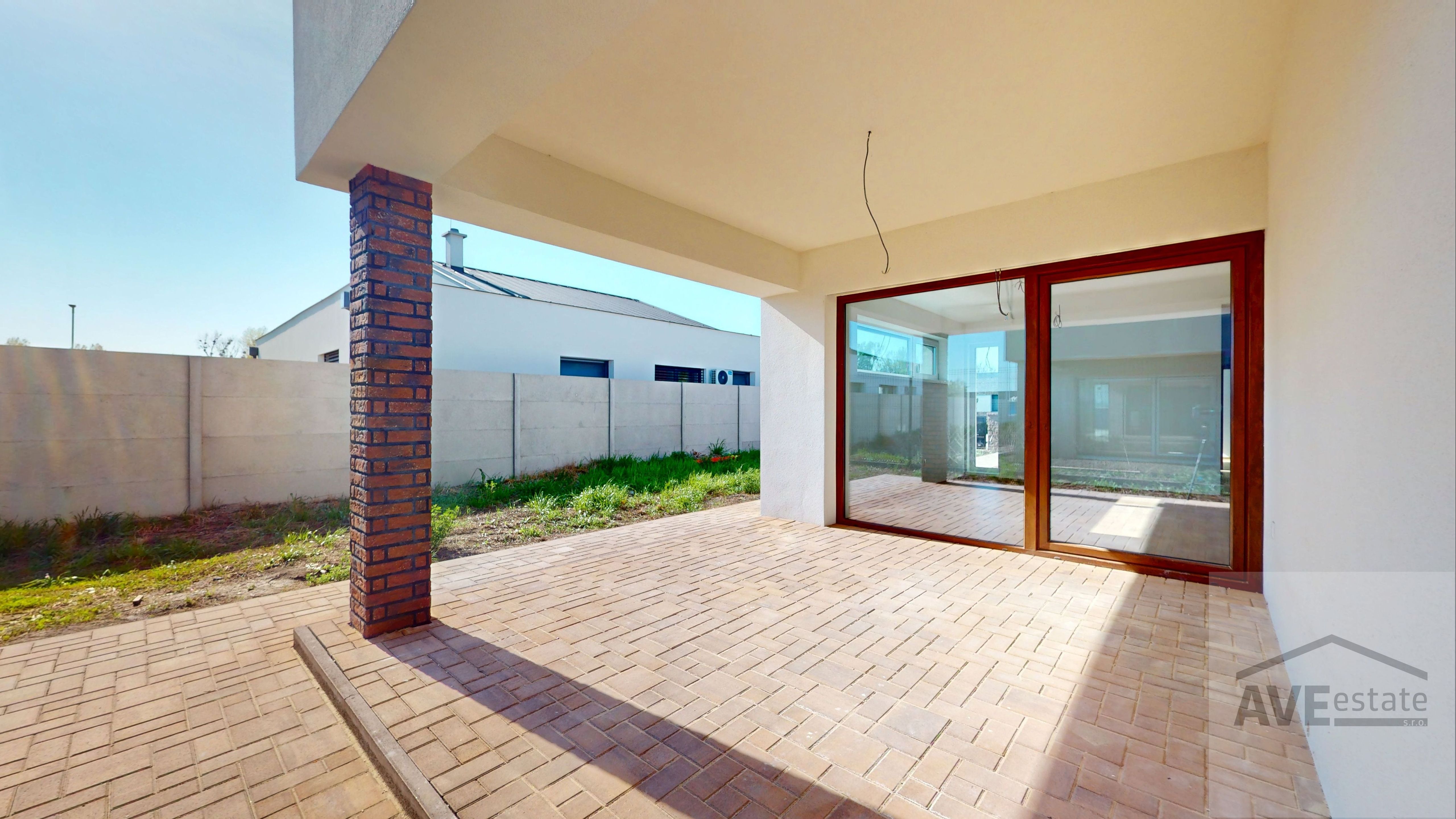 Každý dom má vlastnú priestrannú terasu, ktorá je zastrešená, vlastné parkovacie miesta pre každú polovinu domu.