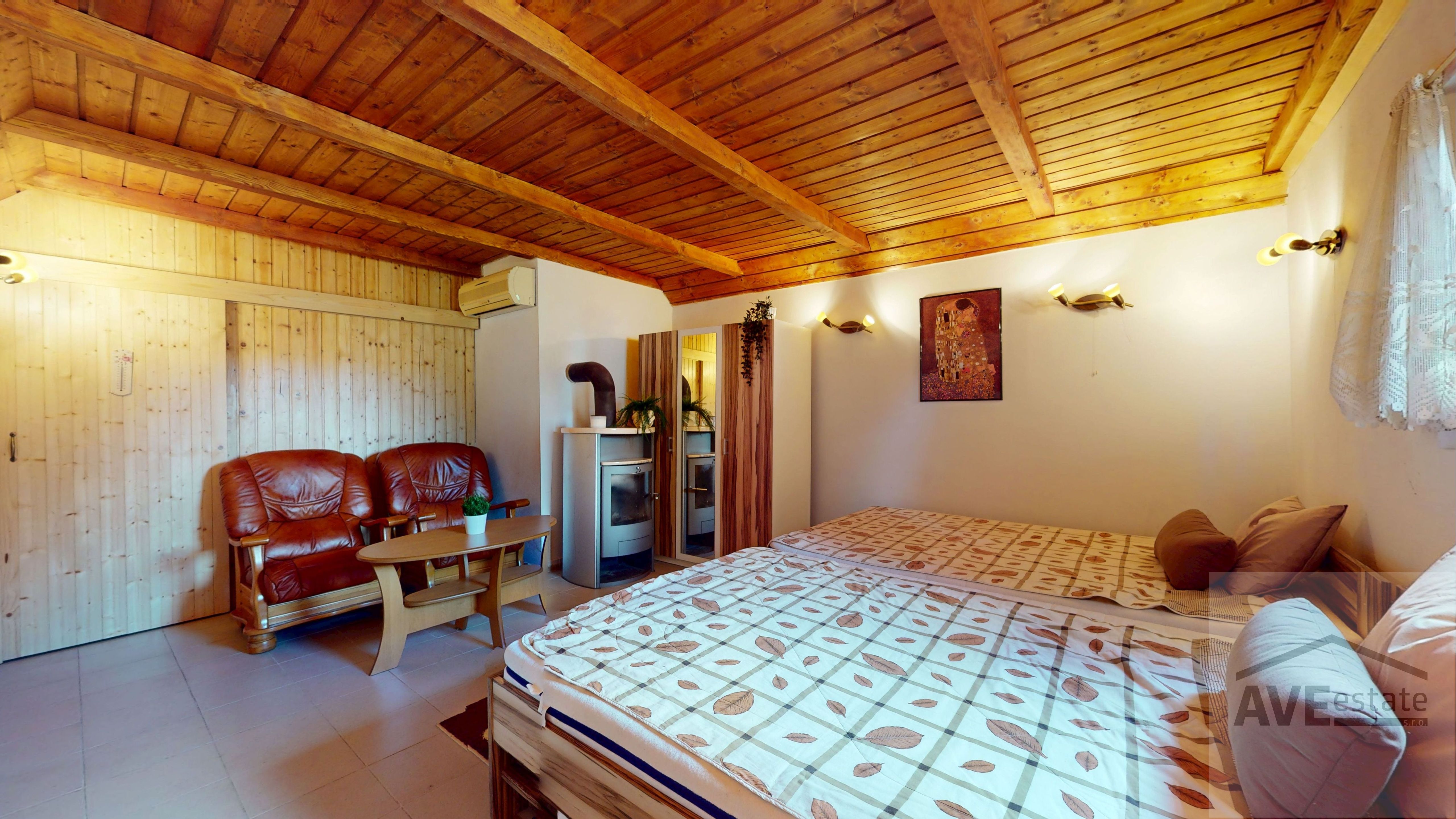 Interiér je útulný s dreveným obkladom na strope, je kompletne zariadený a pripravený na okamžité používanie. Skladá sa z prvej izby spojenej s kuchynkou, samostatnej kúpeľne, chodby a spálne s pieckou a klimatizáciou.