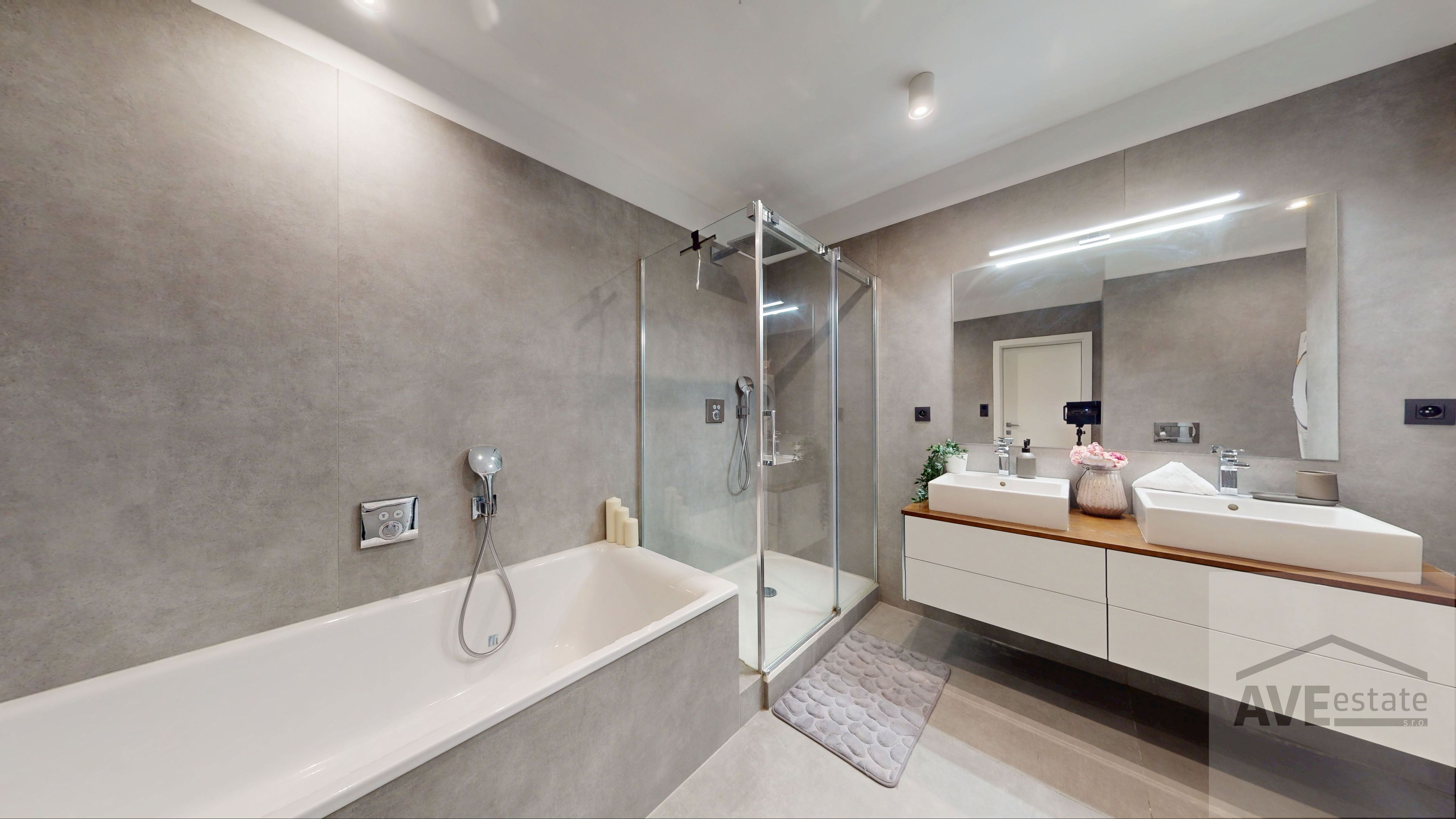 Kúpeľne sú vybavené veľkoformátovou dlažbou a obkladmi, sanitou značiek Hansgrohe (vodovodné batérie), Geberit (WC systémy) a kúpeľňovým nábytkom Duravit.