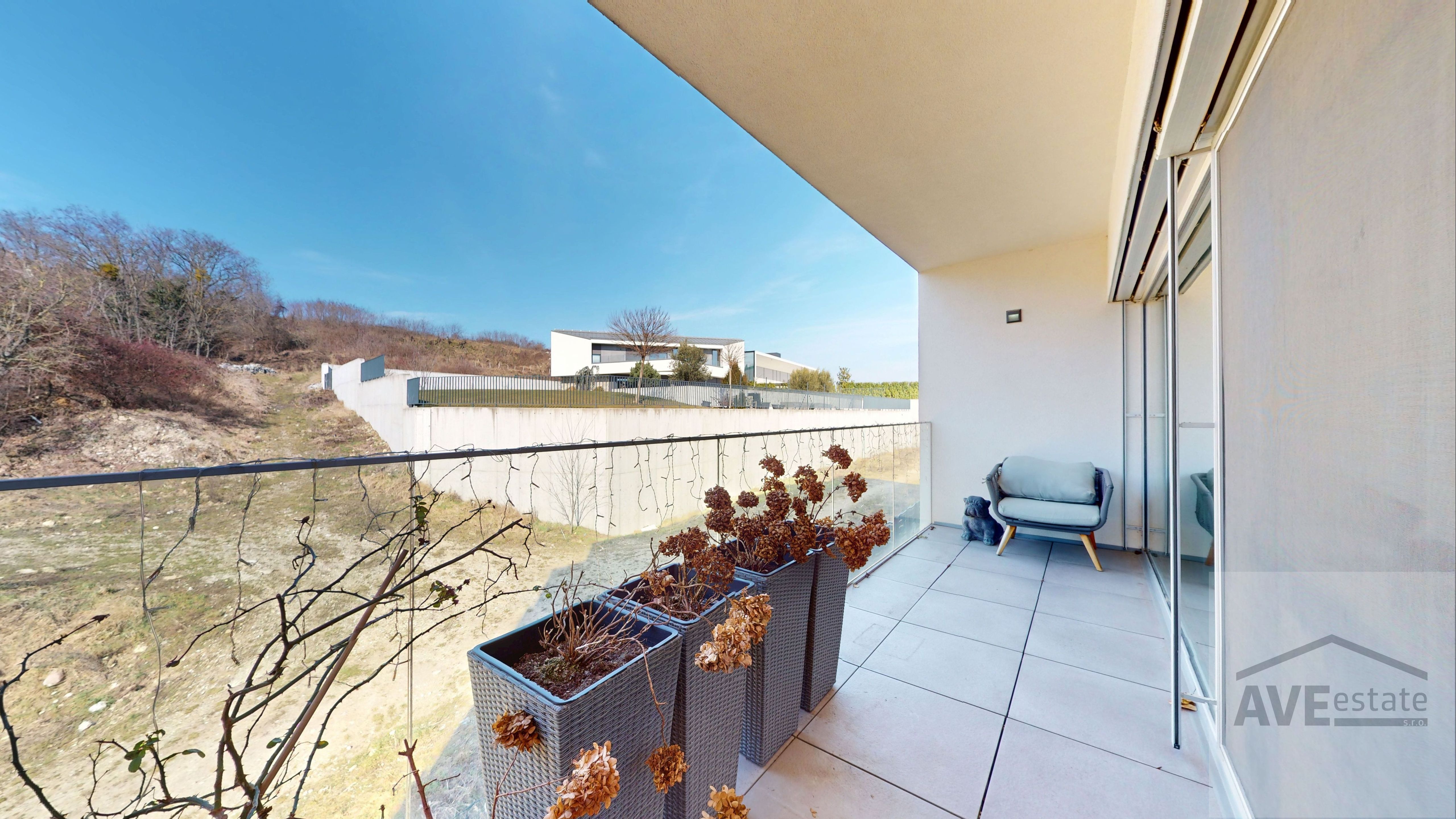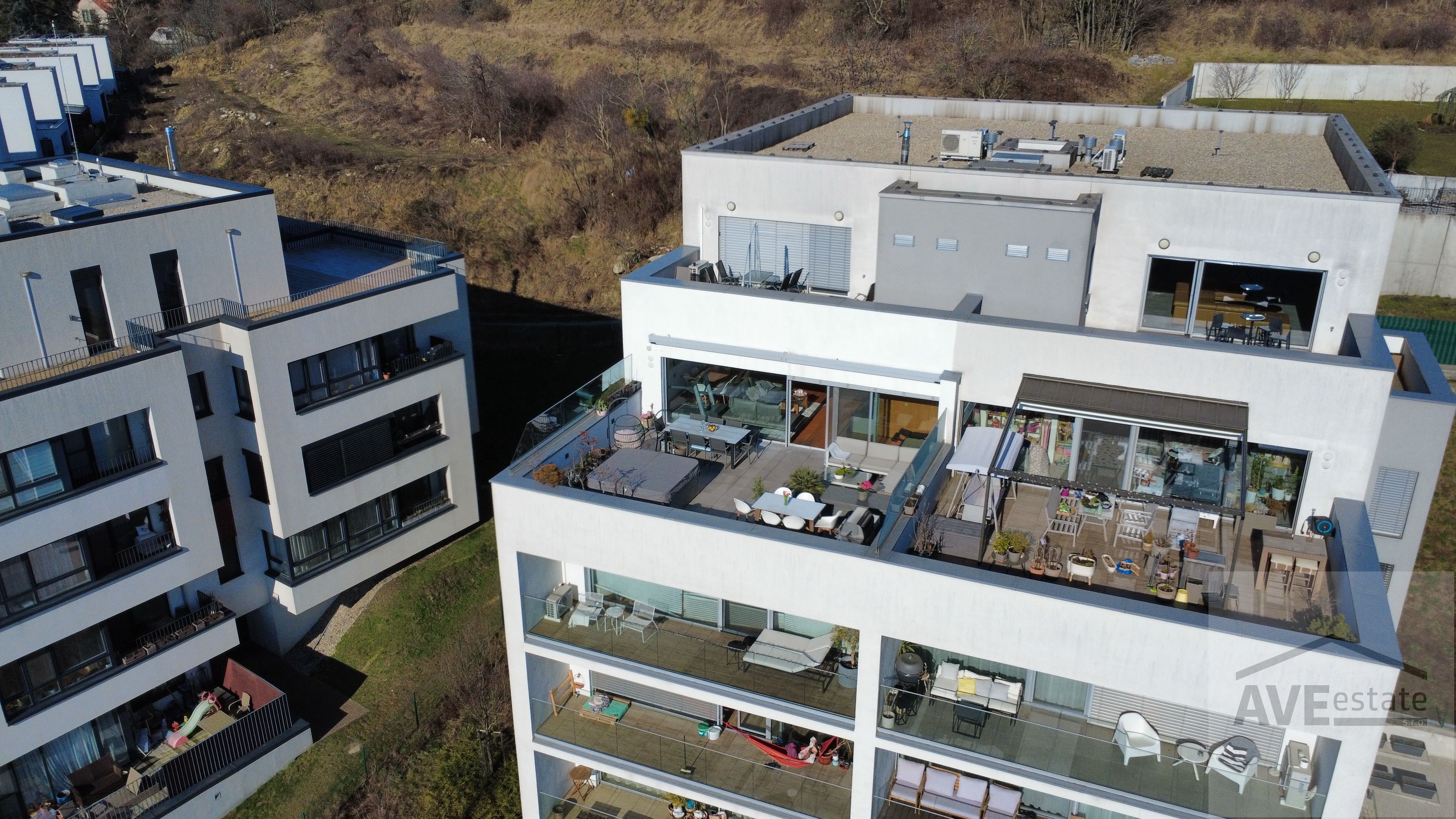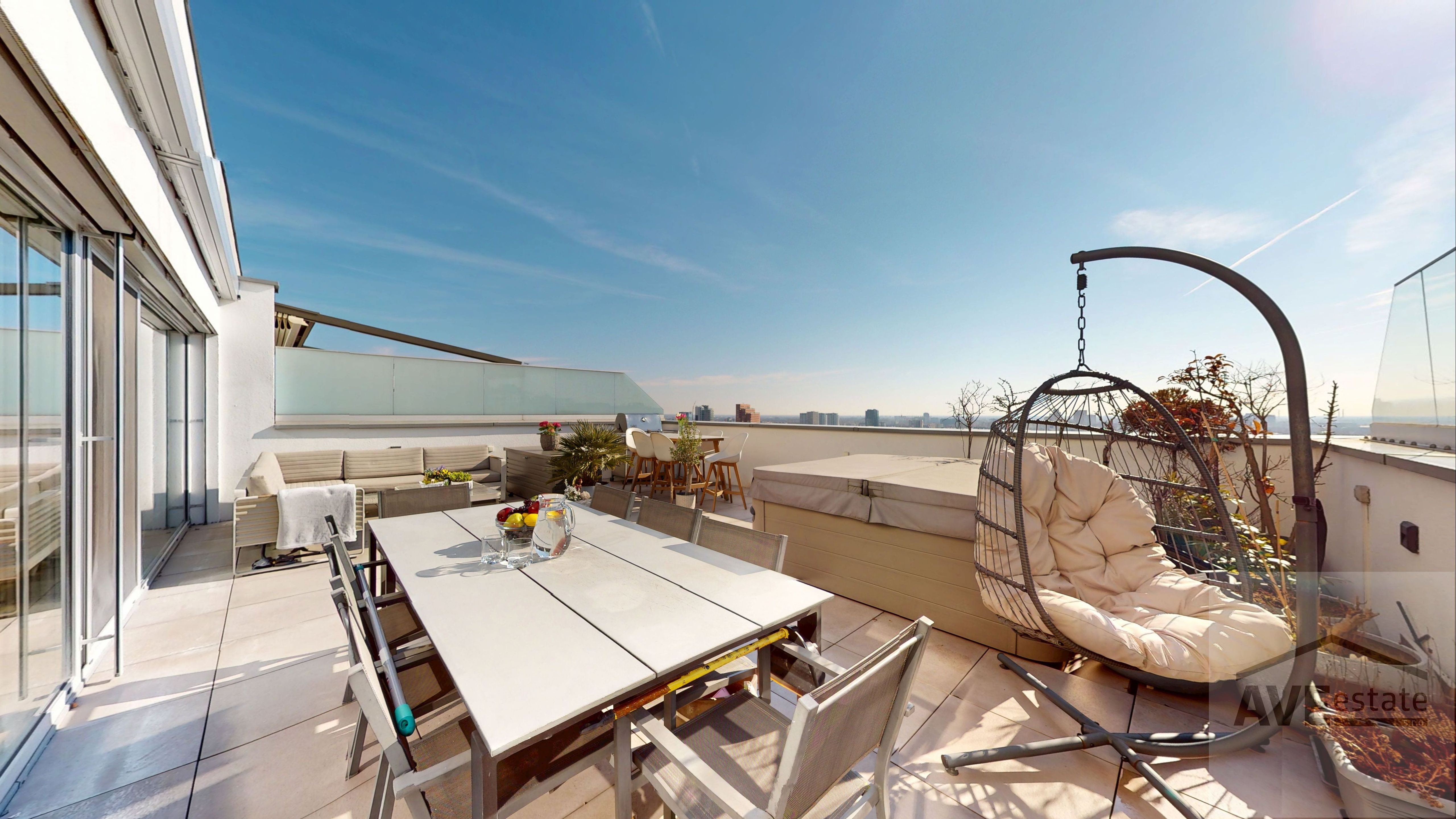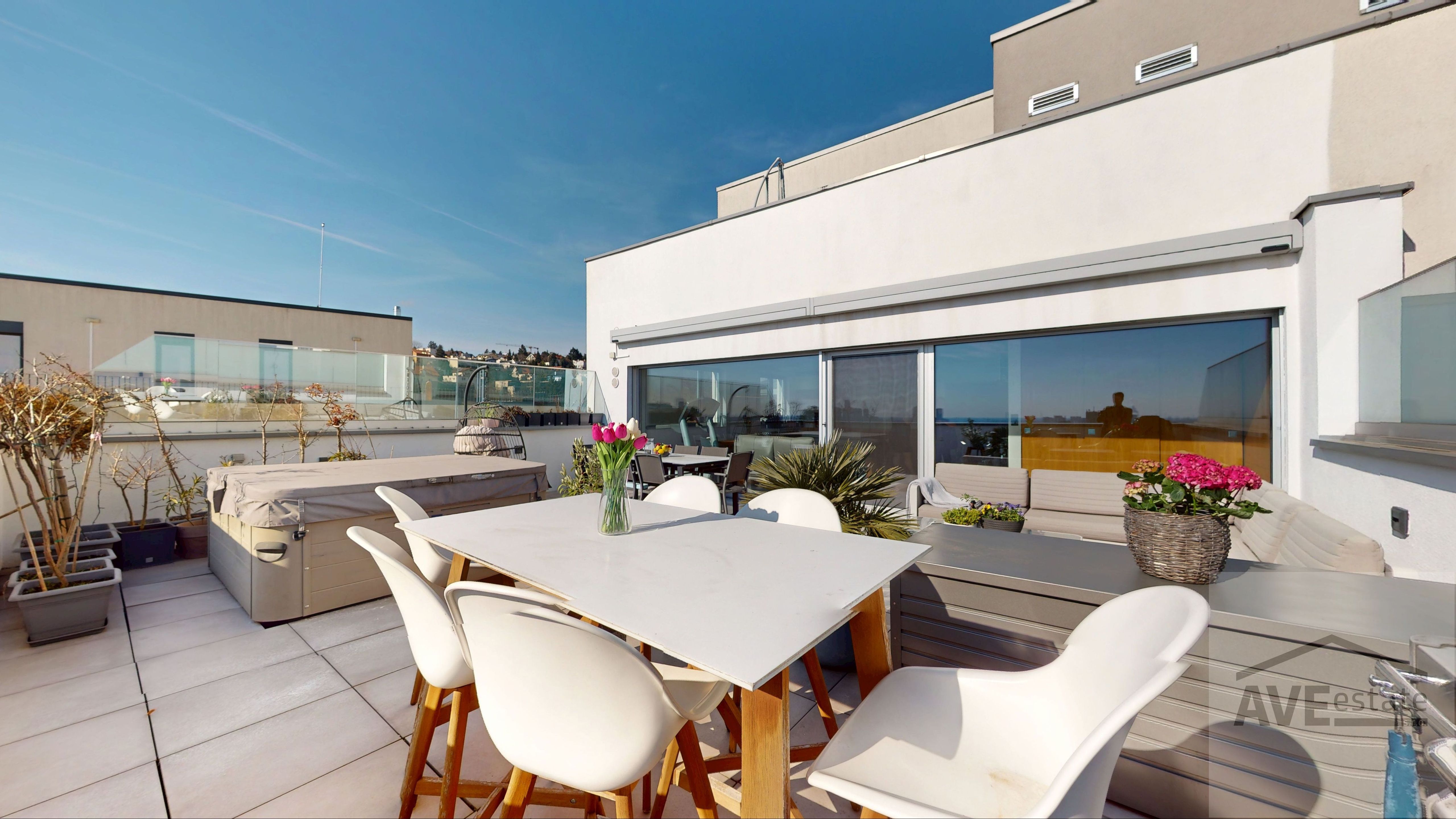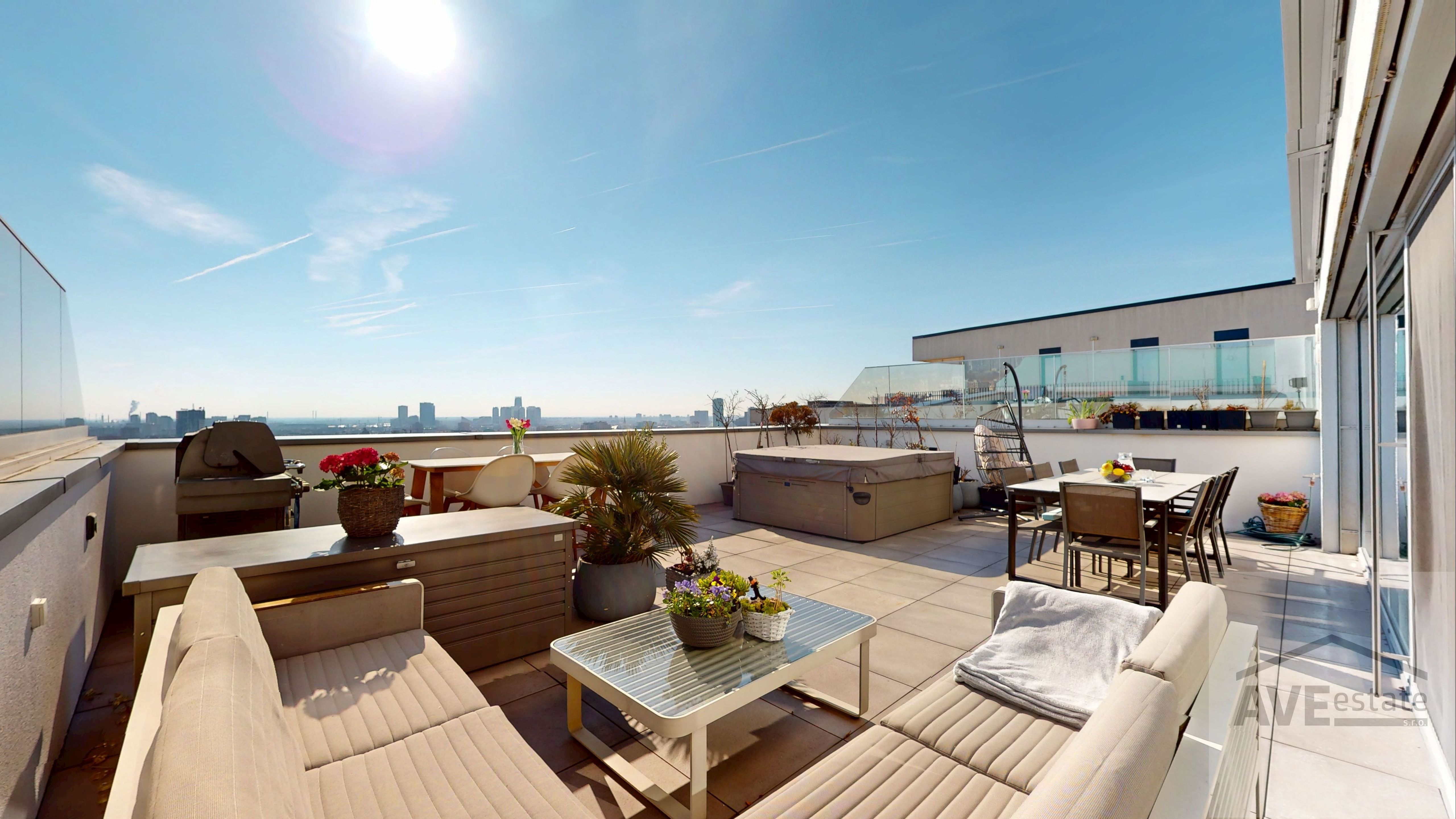 Terasa je vystužená kvôli vírivke, disponuje elektrickými markízami, exteriérovými zásuvkami a nemrznúcimi batériami – ideálny priestor na relax s panoramatickým výhľadom na mesto.