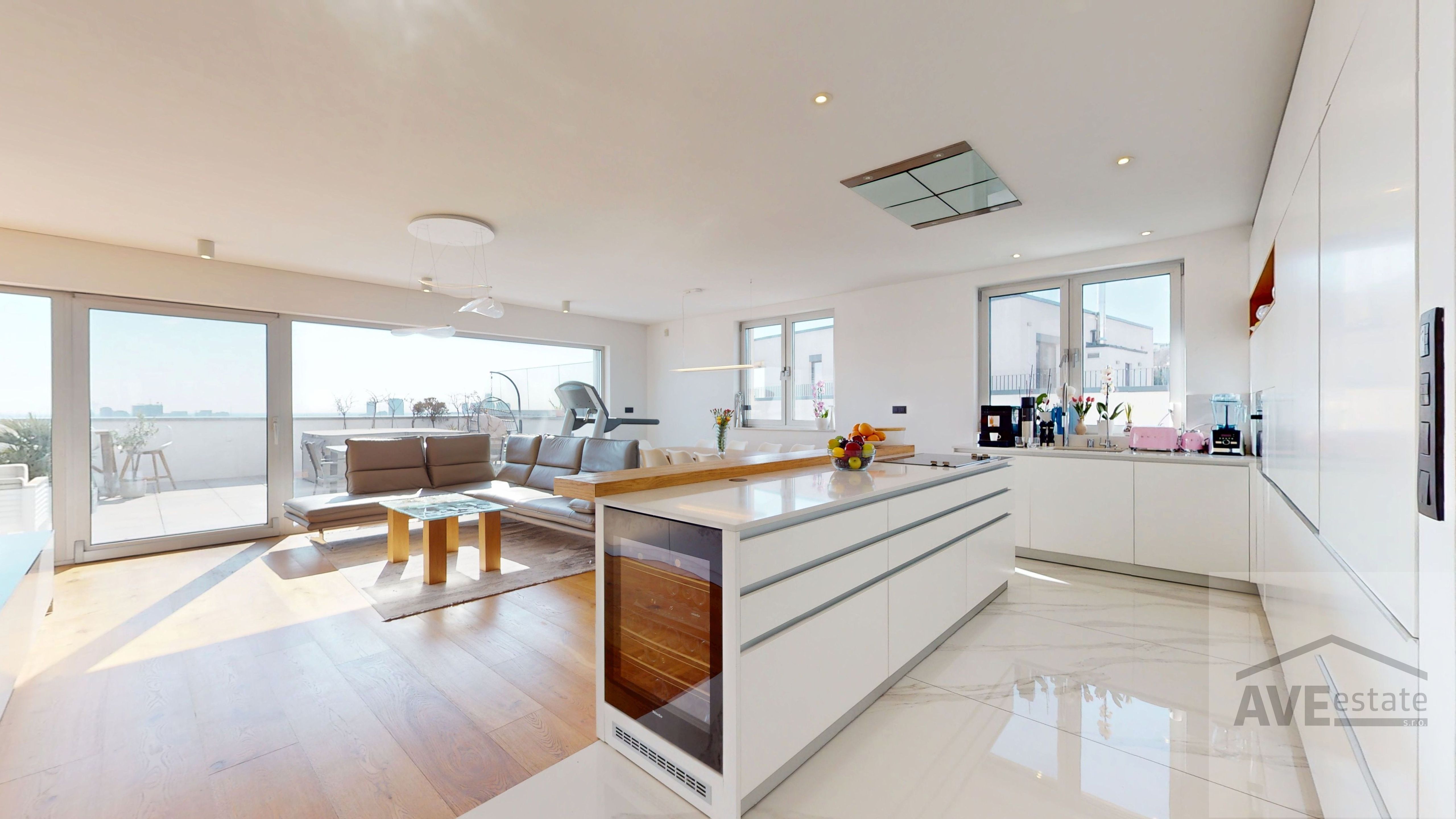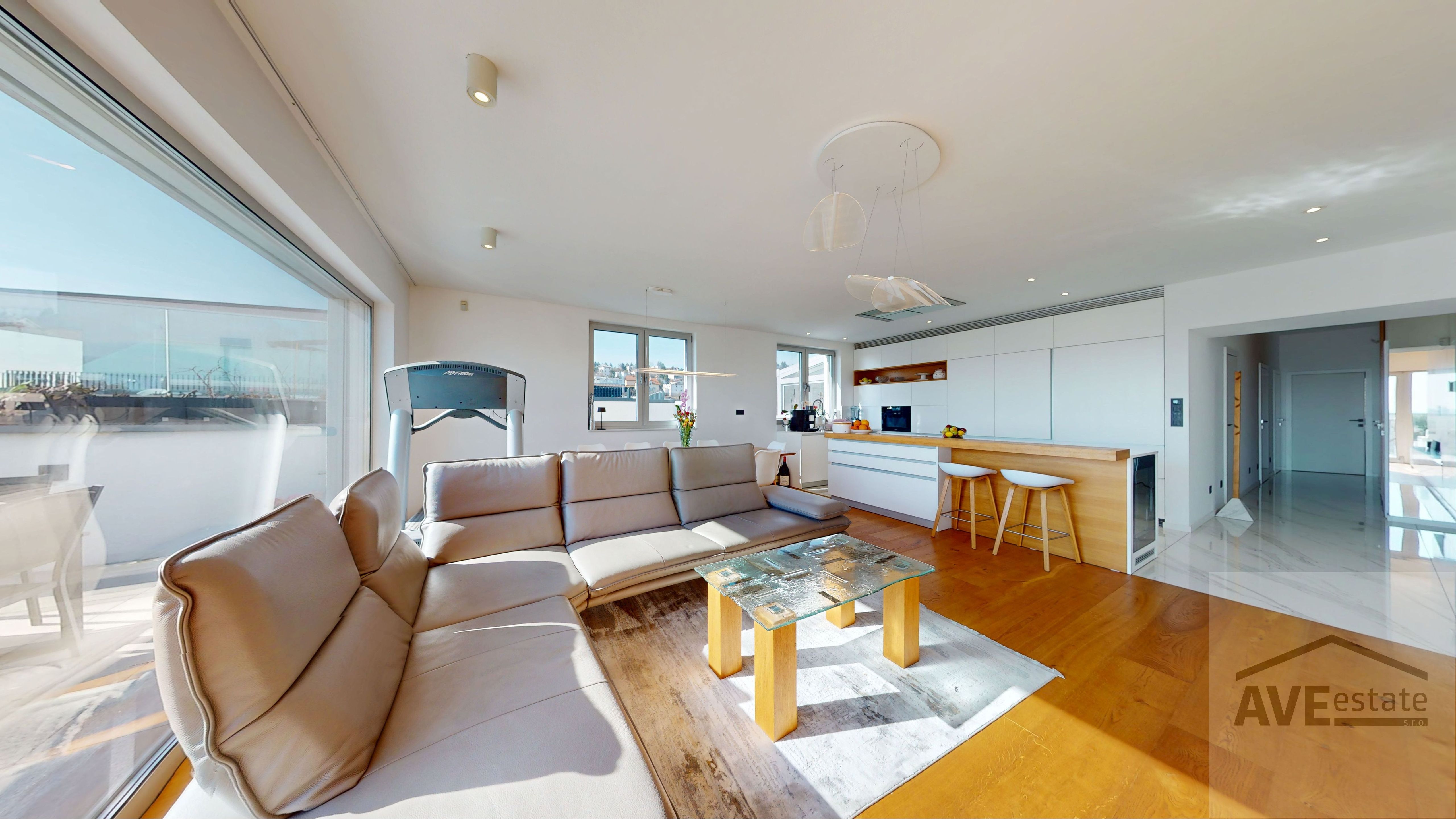 Byt sa nachádza na 4. poschodí z 5 v komornej vile s výťahom, ktorý vedie priamo do garáže. Celková plocha nehnuteľnosti je 247 m², z čoho samotný byt má 144 m².