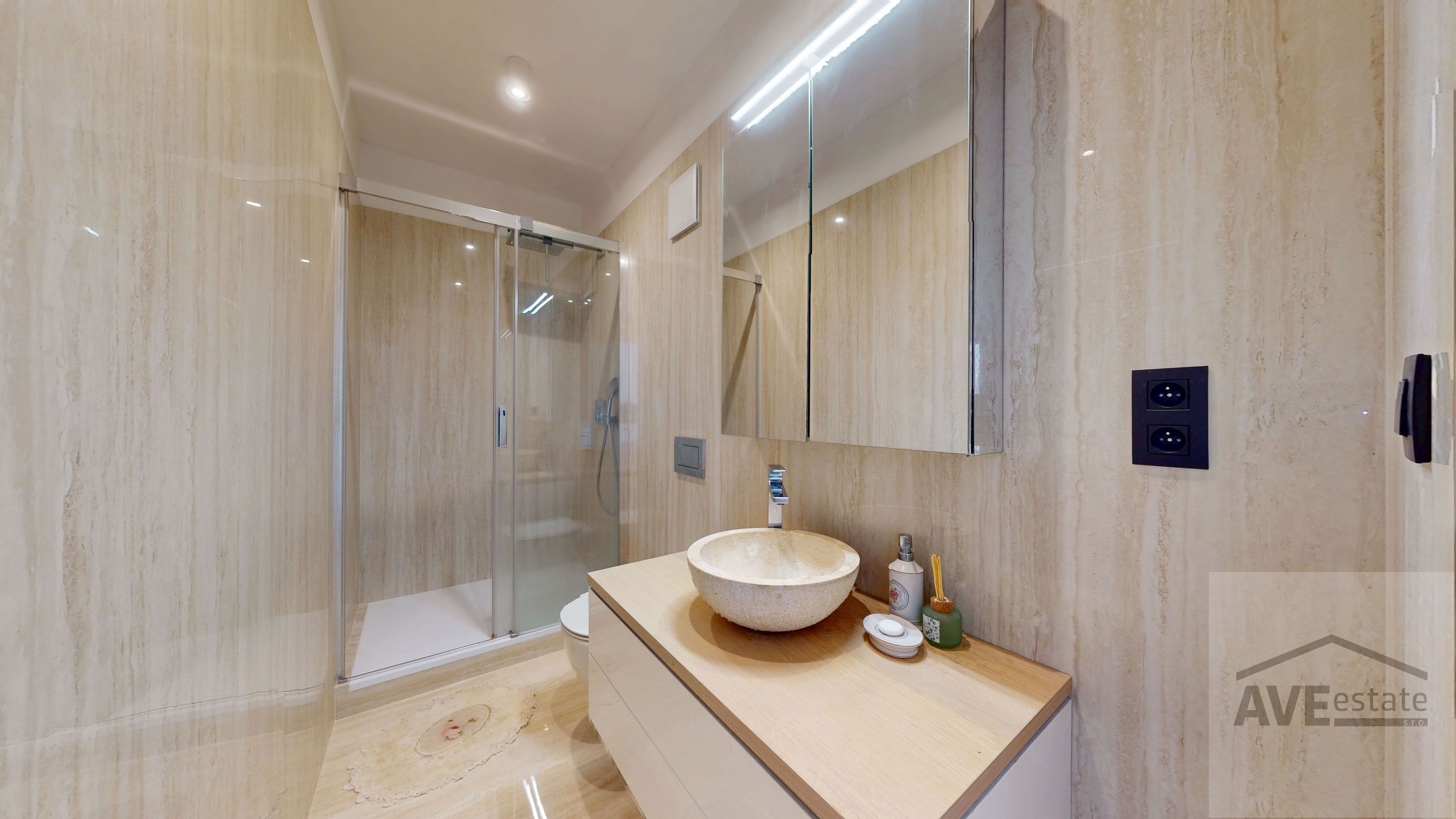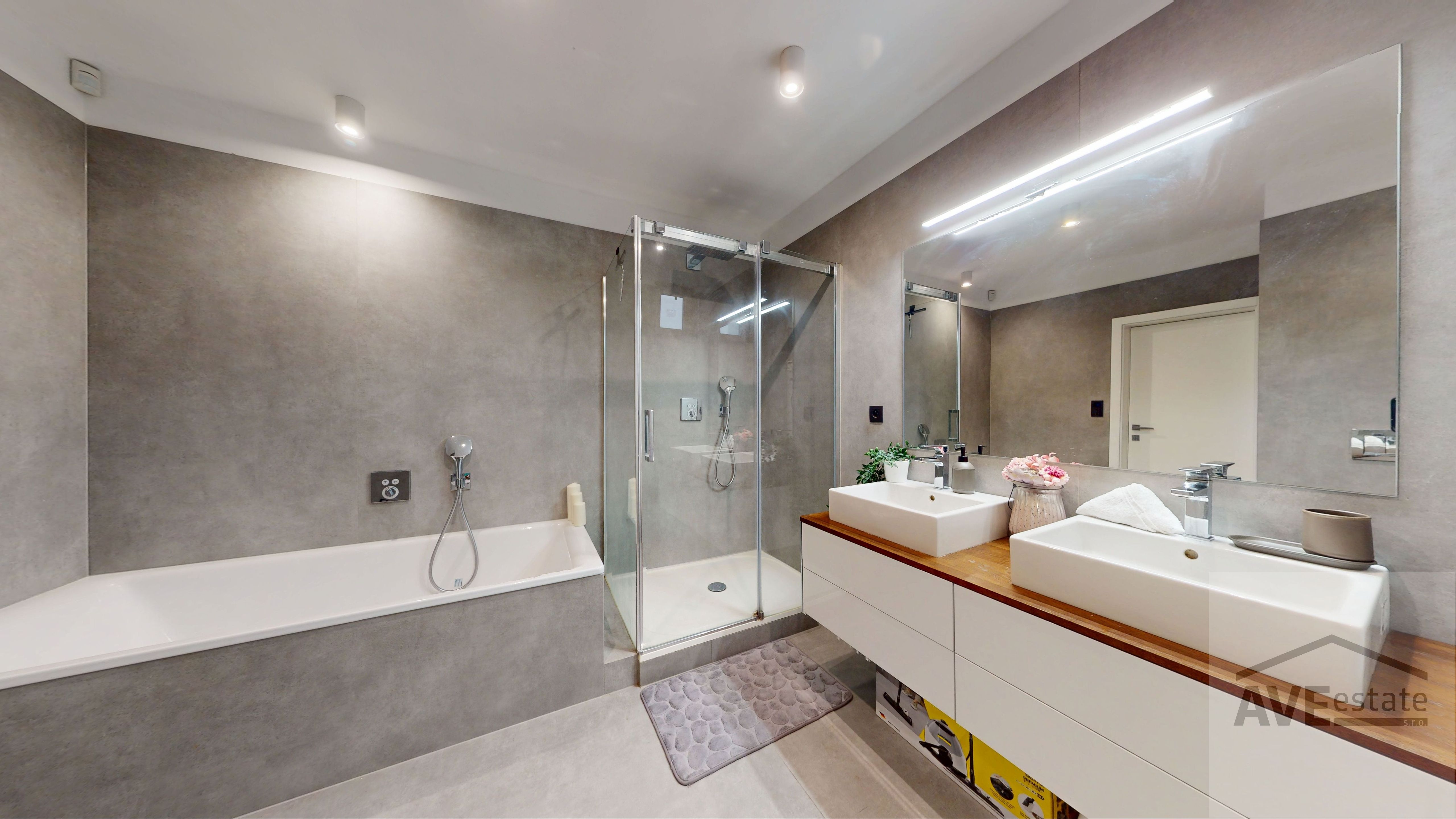 Kúpeľne sú vybavené veľkoformátovou dlažbou a obkladmi, sanitou značiek Hansgrohe (vodovodné batérie), Geberit (WC systémy) a kúpeľňovým nábytkom Duravit.