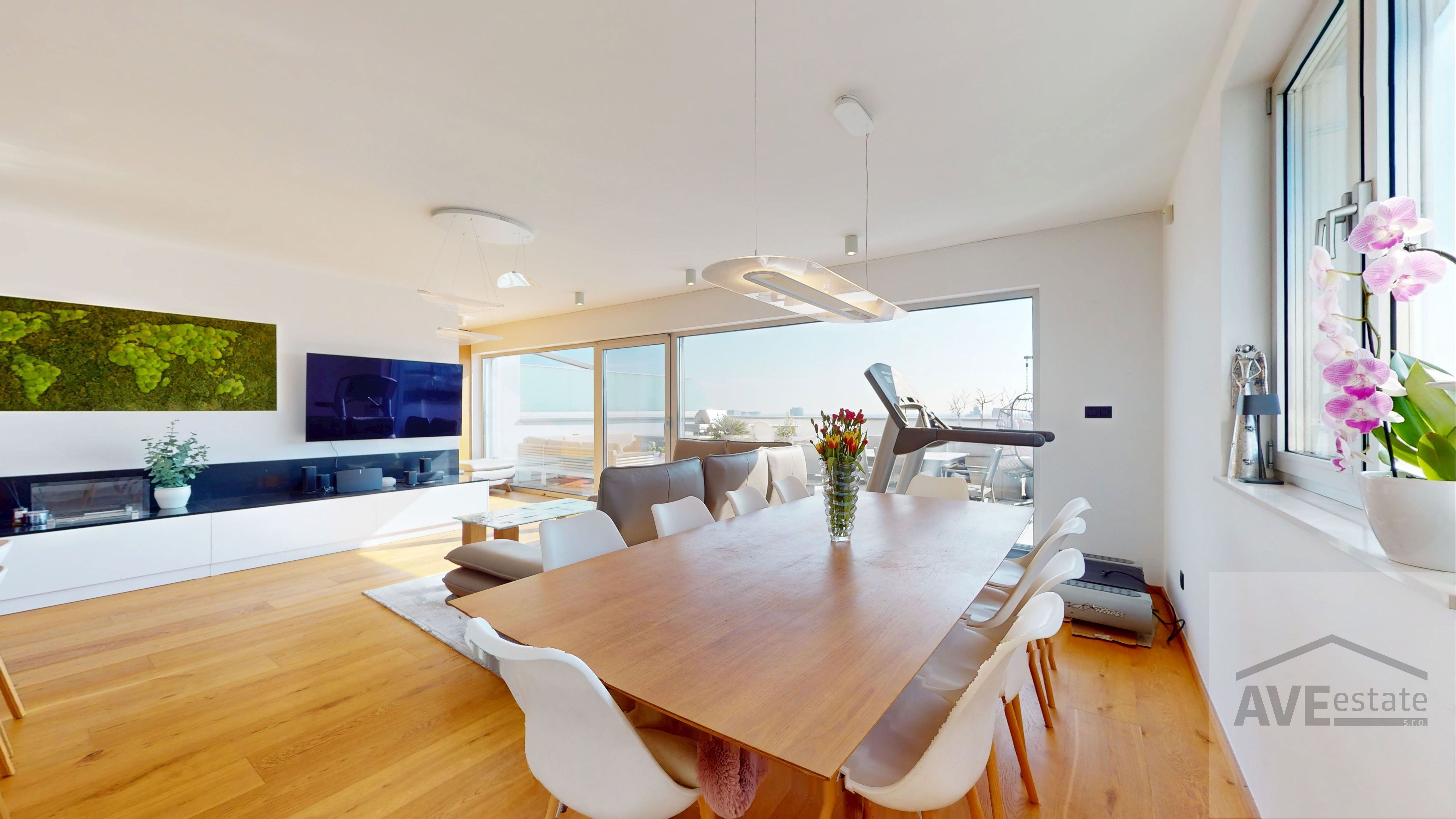 Byt sa nachádza na 4. poschodí z 5 v komornej vile s výťahom, ktorý vedie priamo do garáže. Celková plocha nehnuteľnosti je 247 m², z čoho samotný byt má 144 m².