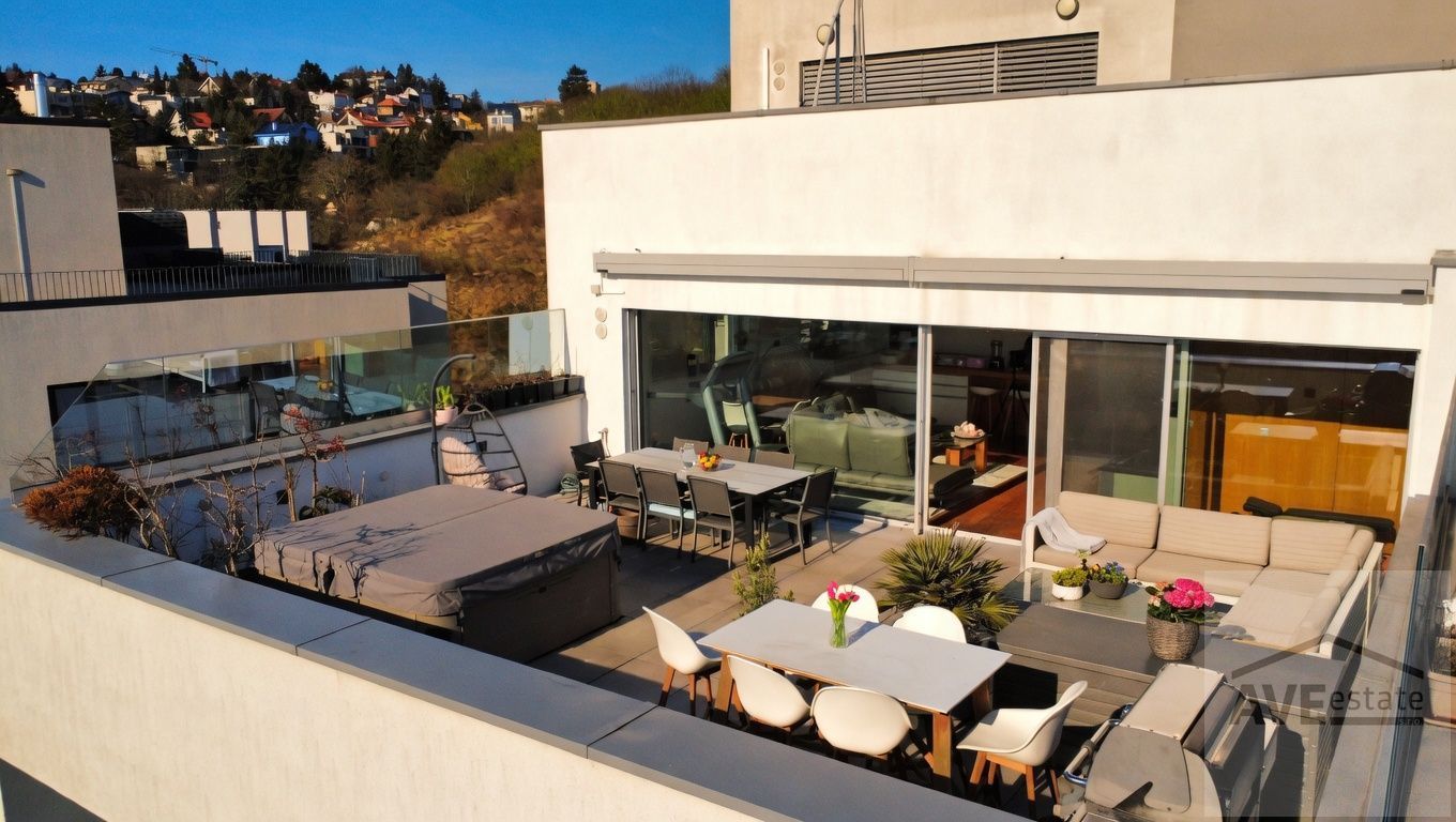 Terasa je vystužená kvôli vírivke, disponuje elektrickými markízami, exteriérovými zásuvkami a nemrznúcimi batériami – ideálny priestor na relax s panoramatickým výhľadom na mesto.