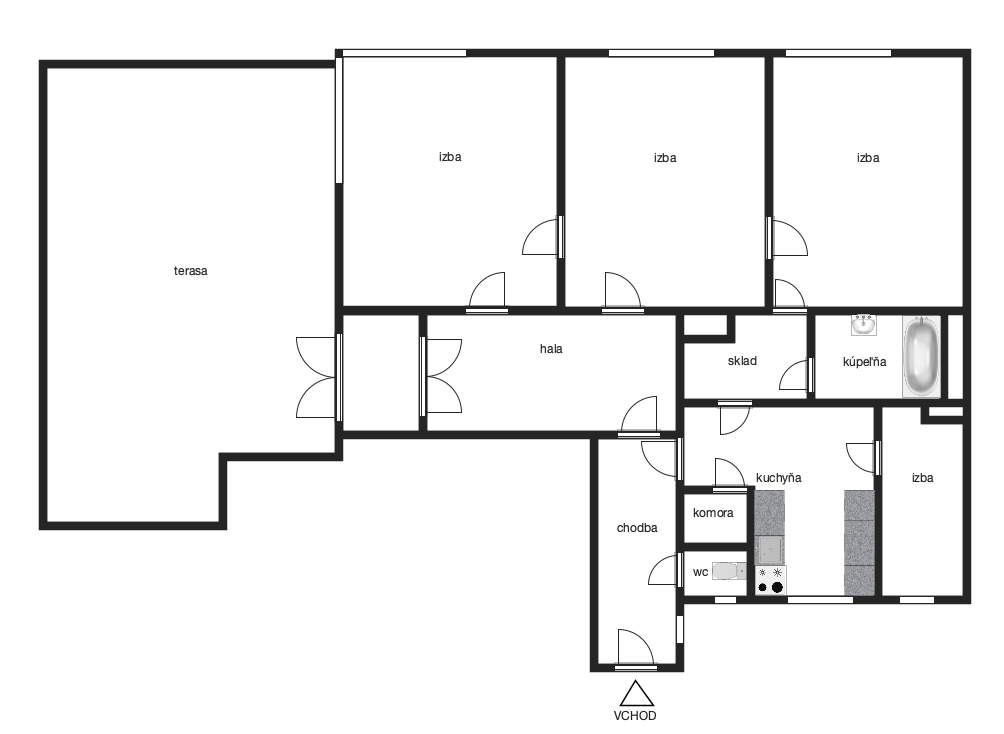 Celková výmera bytu je 102 m², ku ktorým patrí terasa s rozlohou 50 m² – ideálne miesto na relax, rôzne športové aktivity alebo príjemné posedenie. Dispozícia zahŕňa tri priestranné izby, kuchyňu s praktickou menšou miestnosťou, špajzu, kúpeľňu, samostatné WC a sklad.