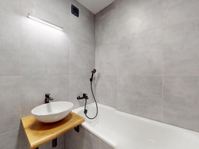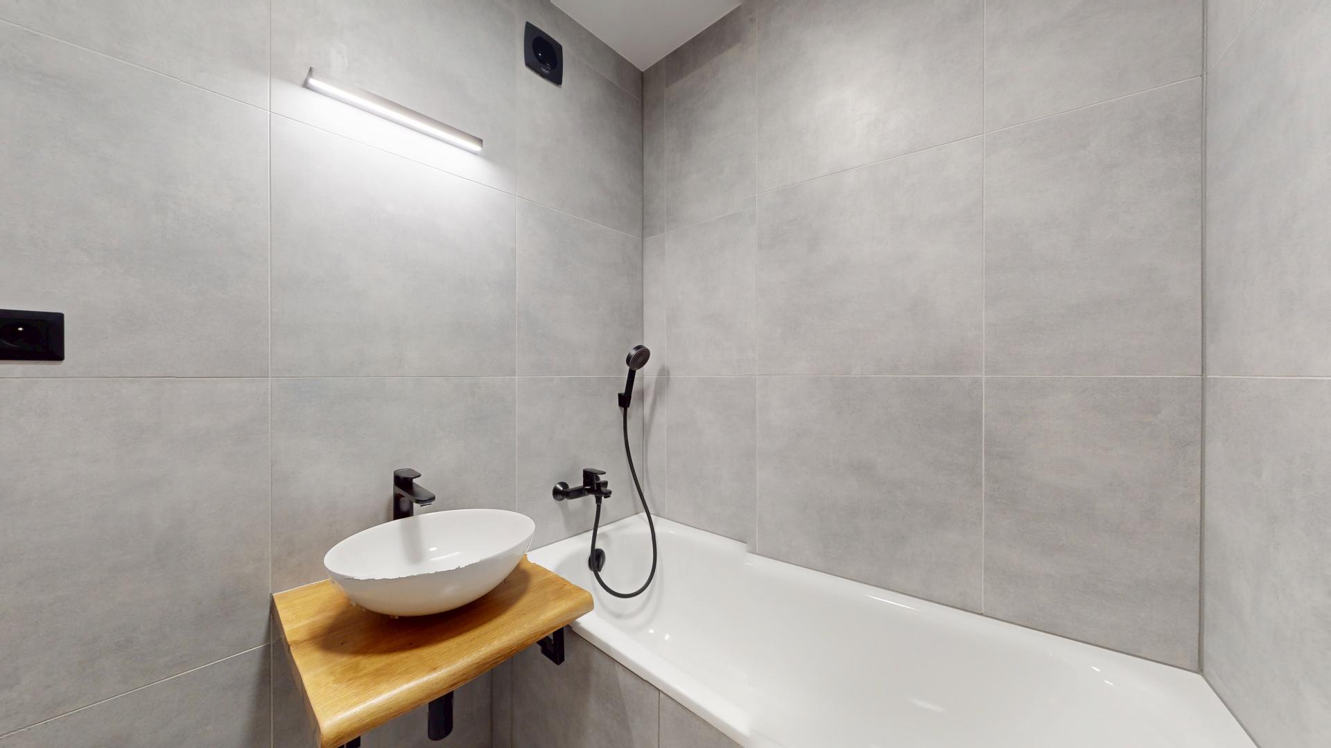 Byt je dokončený do kvalitného štandardu a to: laminátové podlahy, nové dvere a zárubne, obklady, sanita /Hans Grohe, Grohe, Kaldewei/ zásuvky a vypínače Legrand v elegantnej čiernej farbe, sadrokartónové stropy, nové svietidlá, radiátor v kúpeľni.