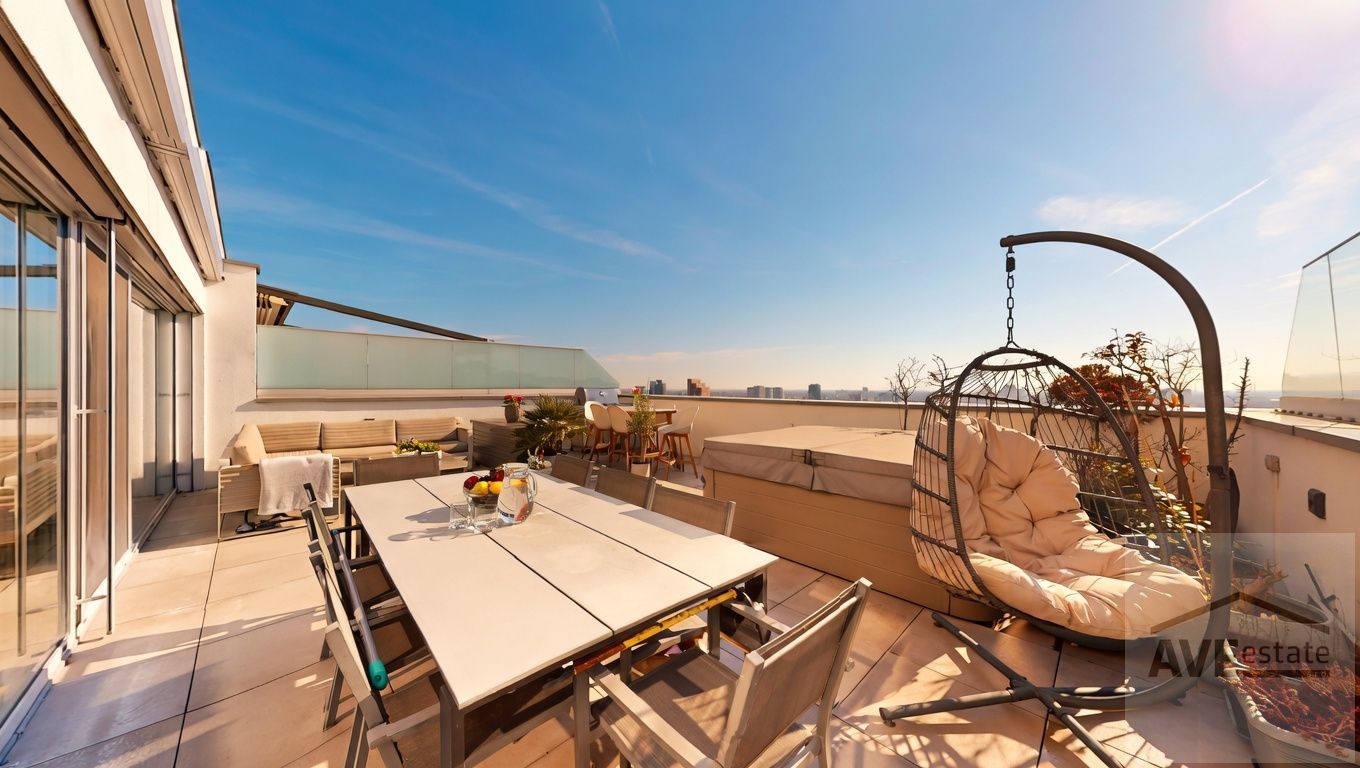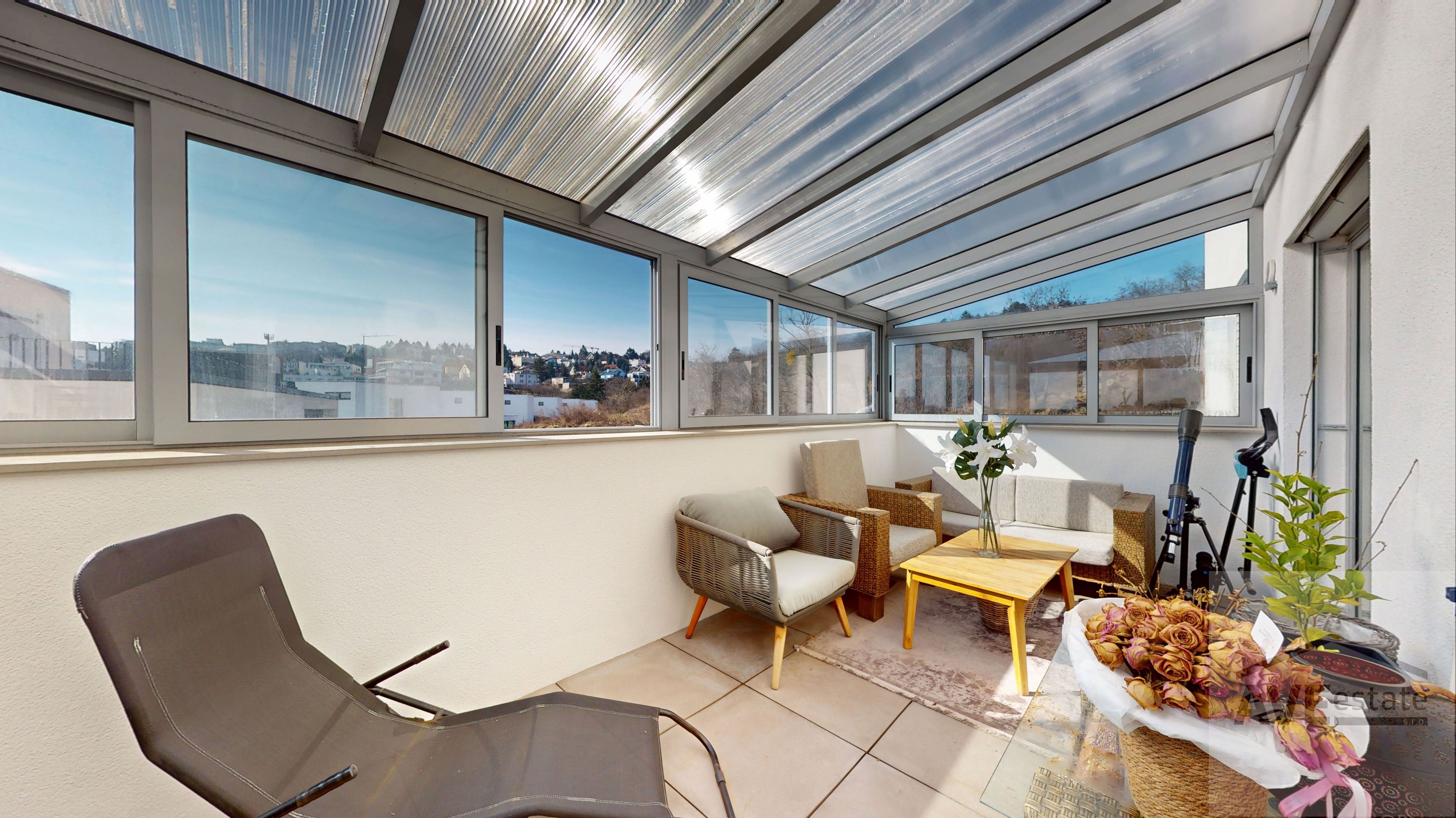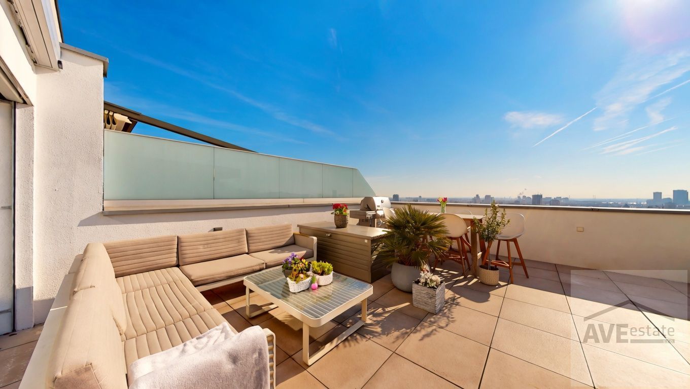Terasa je vystužená kvôli vírivke, disponuje elektrickými markízami, exteriérovými zásuvkami a nemrznúcimi batériami – ideálny priestor na relax s panoramatickým výhľadom na mesto.