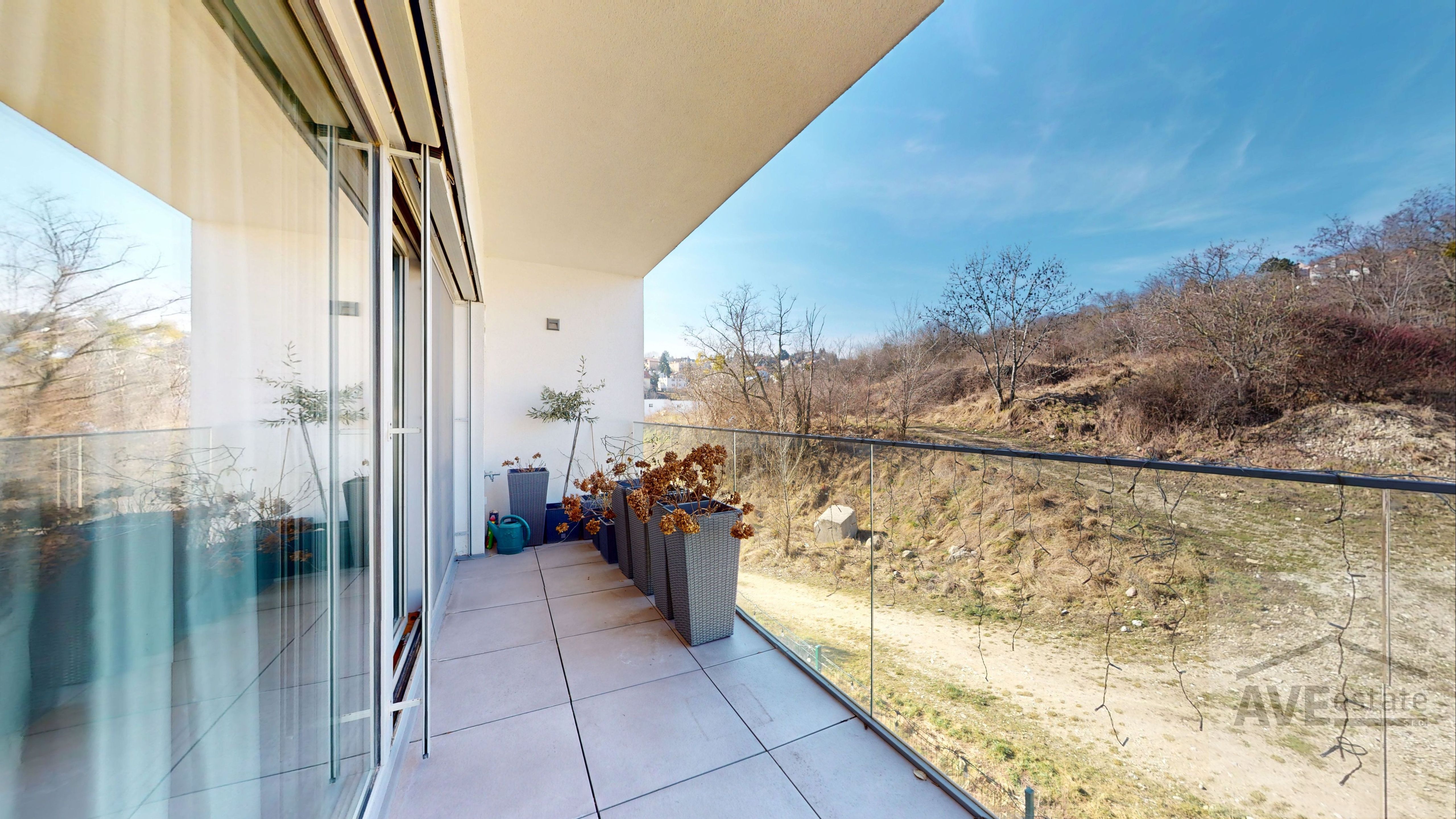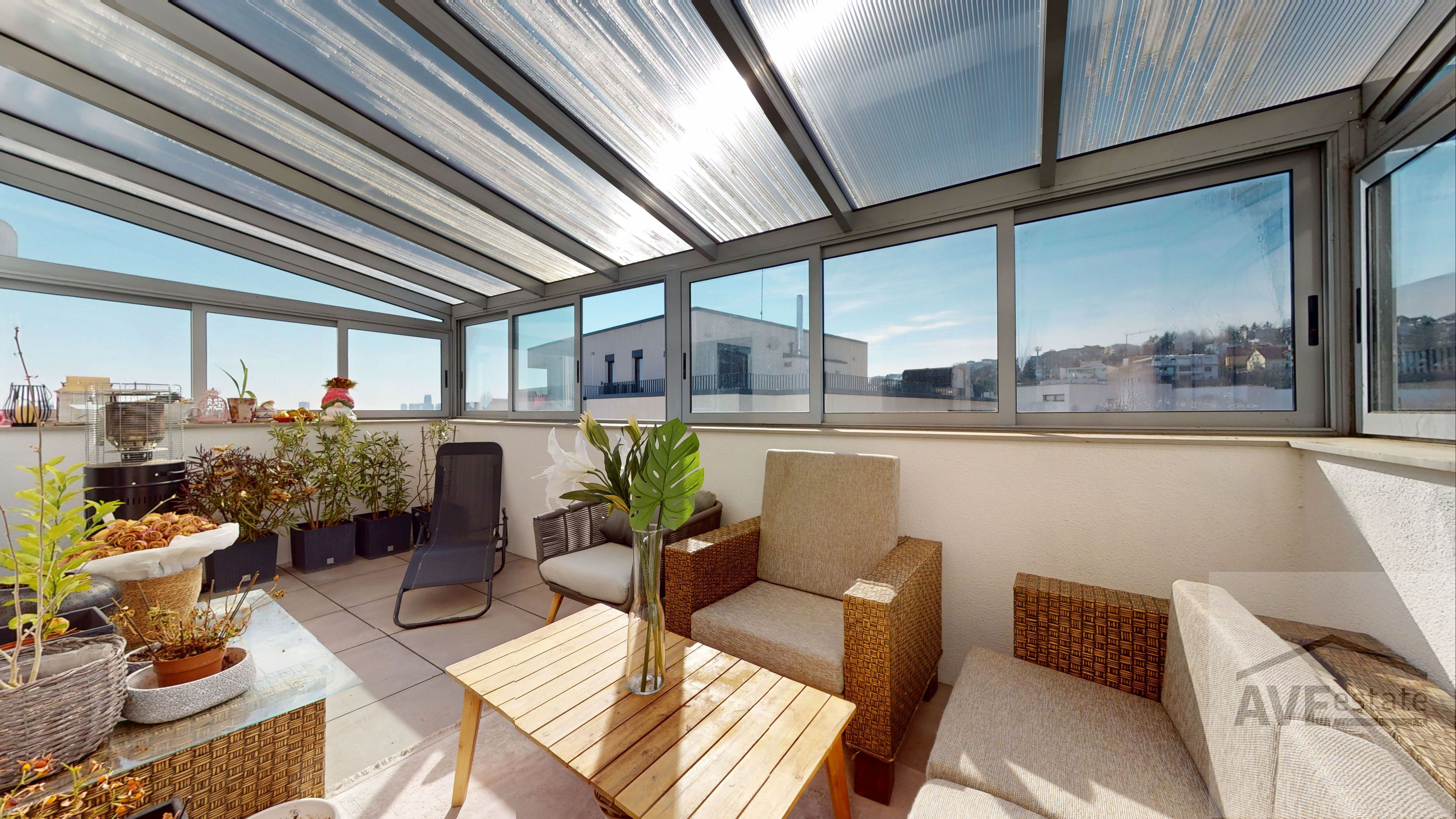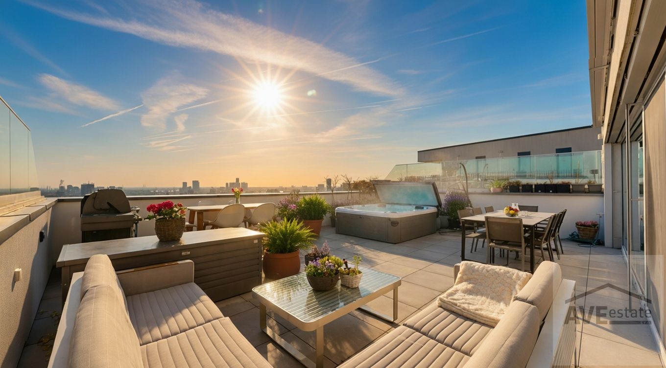 Terasa je vystužená kvôli vírivke, disponuje elektrickými markízami, exteriérovými zásuvkami a nemrznúcimi batériami – ideálny priestor na relax s panoramatickým výhľadom na mesto.